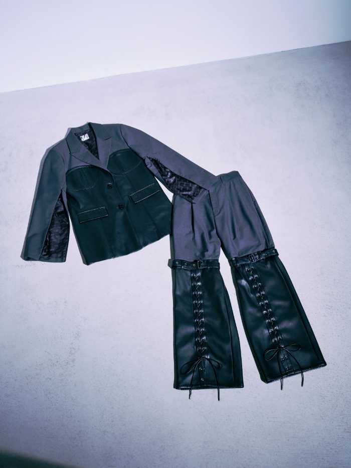 ナナのパンクファッションをイメージしたセットアップで、そで下のZIPやひざ元のベルトによってシルエットの変化を楽しめます。