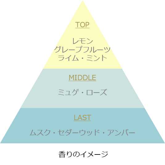 爽やかなシトラスミントの香りが広がり、レモンとミントのフレッシュな香調から、繊細なフローラル、最後はやわらかなムスクへと変化します。