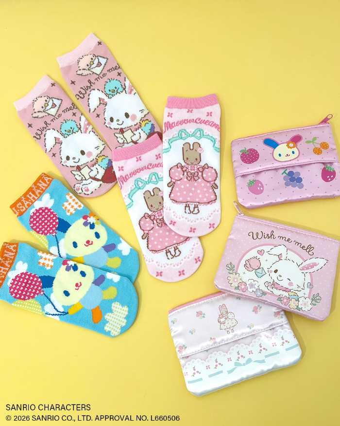 ティッシュポーチはポケット付きでリップや小物を収納でき、外出時に便利。アンクルソックスは足元からさりげなくキャラクターを楽しめるデザインです。