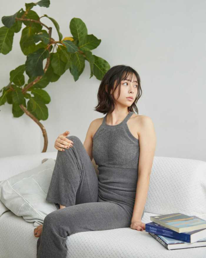 ホルターネックデザインで首元をすっきり見せながら、お腹をやさしく温めてくれるインナー。