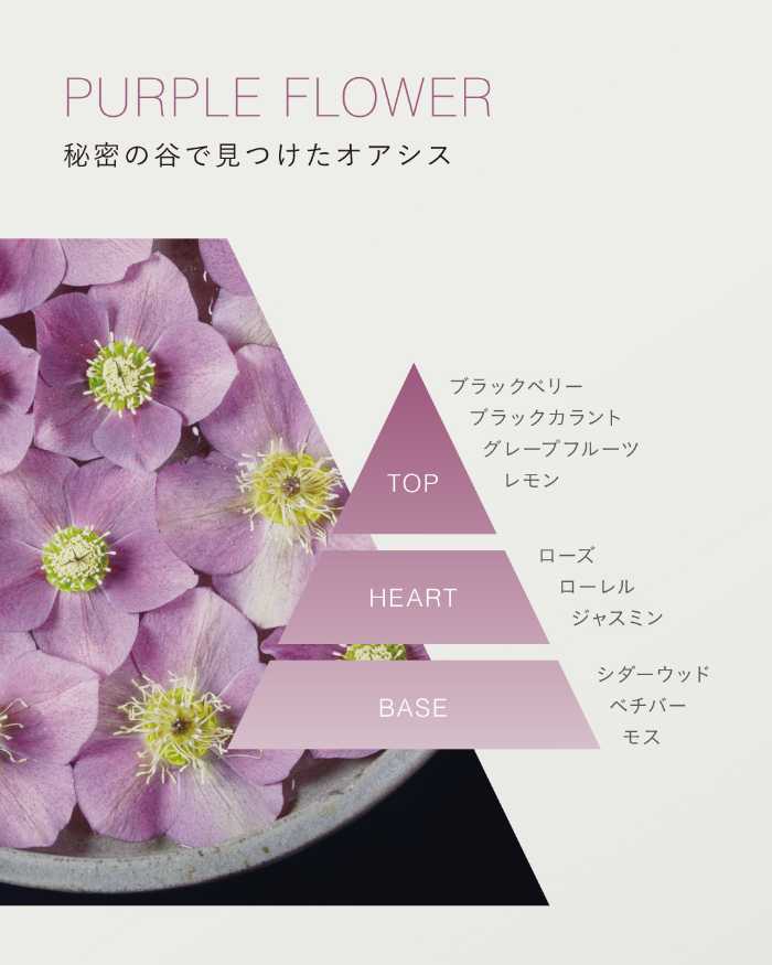 フレッシュなシトラスの爽やかさから始まり、野に咲く花々を思わせるフローラルとサンダルウッドの温もりが重なり合う、ほのかに甘くみずみずしい香りです。