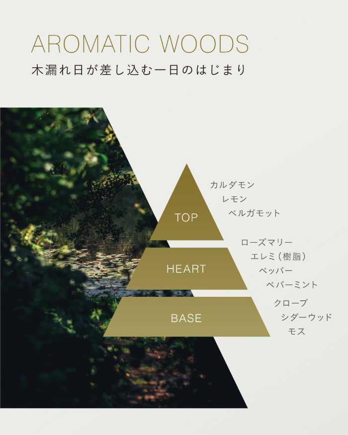 木漏れ日が差し込む森の朝を思わせる爽やかな香り。シトラスノートにカルダモンのスパイス感、澄んだハーバルノートが広がり、最後はシダーウッドの温もりが穏やかな余韻を残します。