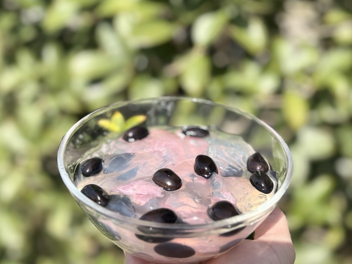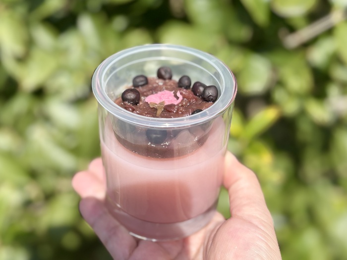 おしるこジュレにみずみずしい寒天、ふわりと桜香るピンク色の桜寒天。3日間じっくりと煮込み、ふっくらとした丹波黒豆を使用した自家製黒豆。