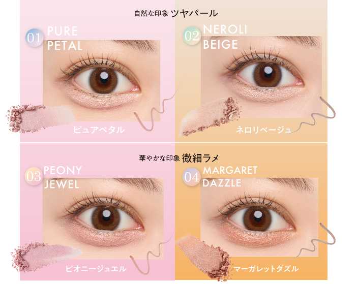 01・02はツヤタイプ、03・04はラメタイプで、それぞれ異なる輝きを楽しめます。