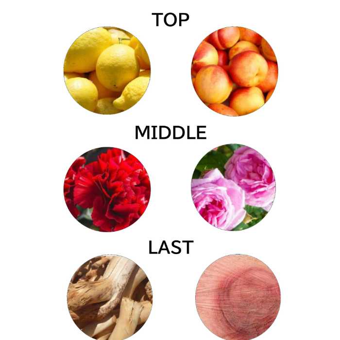 みずみずしいピーチとイタリアンレモンが広がる爽やかなトップノートから、カーネーションとセンティフォリアローズの華やかなミドルへと変化。