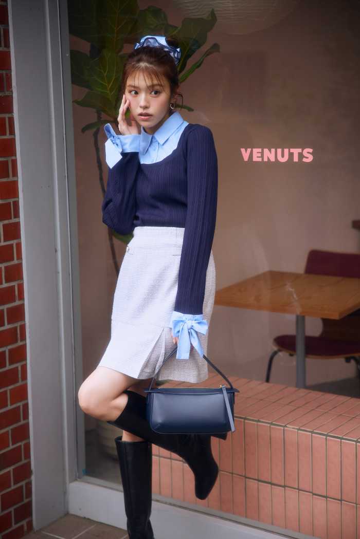 LOOK1は、KNIT(9,790円)とSKIRT(12,100円)にBAG(7,590円)を合わせたフェミニンコーデ。
