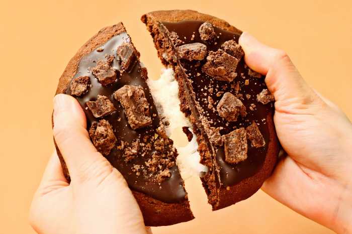 チョコチップを練り込んだココアクッキー生地の中に餅を包み焼き上げ、上掛けチョコをコーティング。さらに砕いたブラウニーをトッピングし、食感のアクセントをプラスしました。