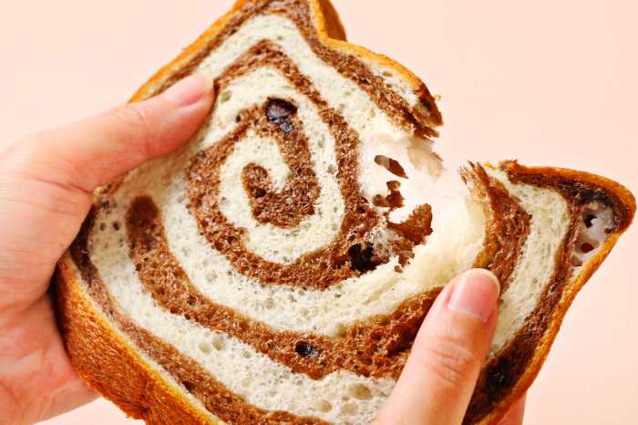 チョコを練り込んだ生地にチョコチップを混ぜ込み、水を使用せずミルク100%で仕上げたプレーン生地を重ね、ぐるぐる模様に焼き上げた可愛らしい食パン。