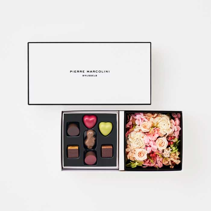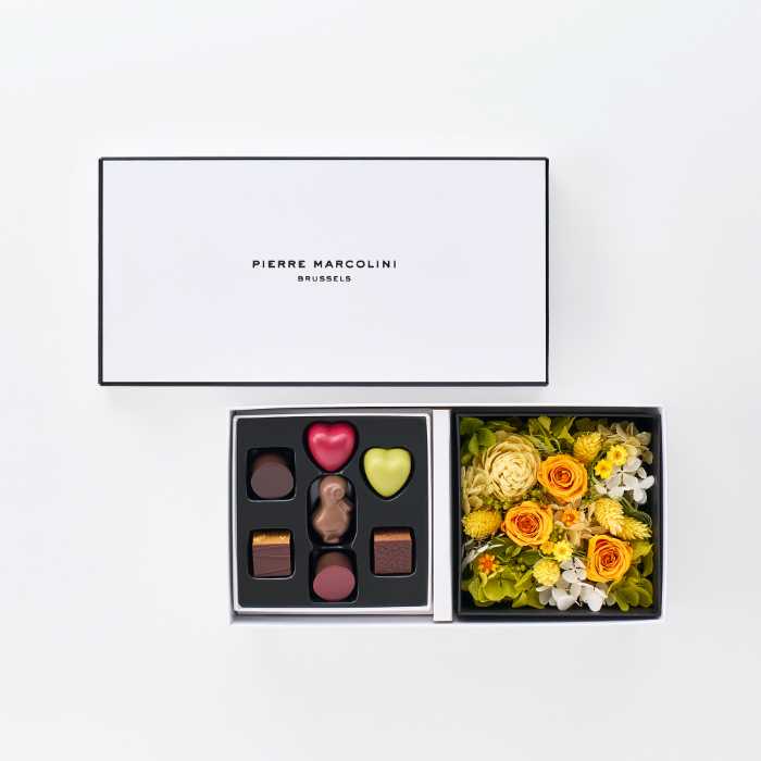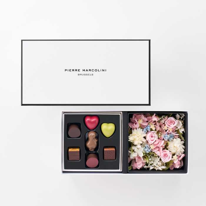 プリザーブドフラワーと人気ショコラ「セレクション7個入り」を組み合わせた特別なアソートメント。