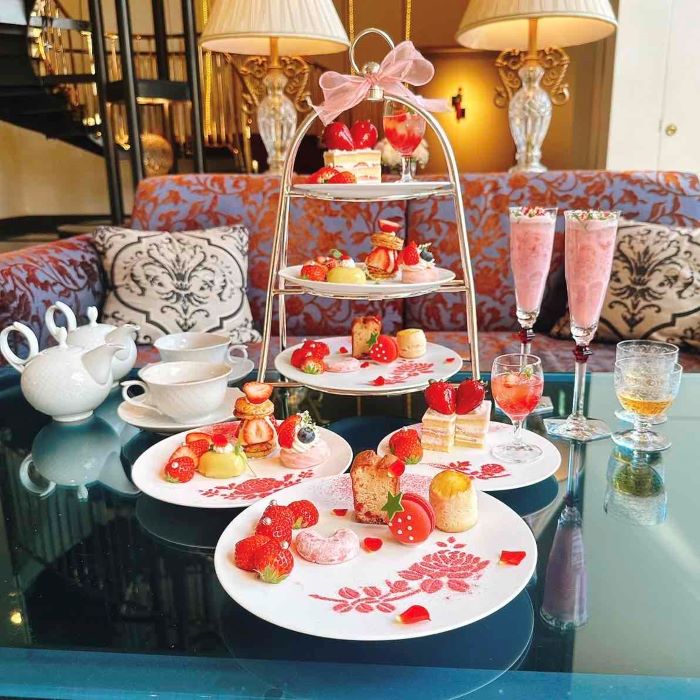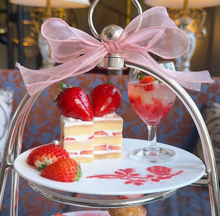 ウェスティンホテル大阪のロビーラウンジでは、2026年5月6日まで「ストロベリーアフタヌーンティー」を提供中。目を引くのは、大粒の希少いちご「あまりん」をのせた、可愛い「いちごのショートケーキ」です。スタンドには、その時期に美味しい苺を使用した「いちごのミルフィーユ」など、多彩な苺の魅力を楽しめるスイーツが並びます。ピンクのリボンが飾られた、春らしい華やかな雰囲気に包まれます。