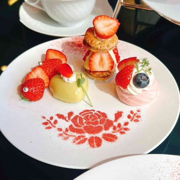 3段のティースタンドには、スイーツとセイボリーが並び、まるで絵画を眺めているような美しさです。スイーツを乗せた真っ白なお皿には、ドライイチゴとラズベリーを使い、一輪の薔薇の花が描かれています。お好みのお飲み物とともに、贅沢な時間をお過ごしください。