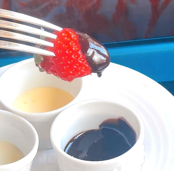いちごは、お好みで練乳やチョコレートソースを添えて楽しめます。甘酸っぱい果実に、まろやかな練乳や濃厚なチョコレートソースが重なり、味わいの変化も魅力です。