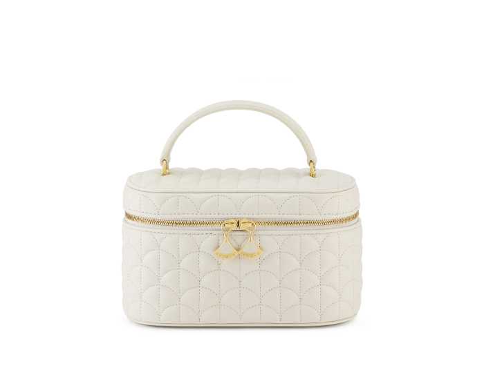 カーフレザーのマトラッセ加工で“カラ”パターンを表現し、コンパクトながら収納力のあるデザイン。レザーハンドルと取り外し可能なチェーン付きで、エレガントさと実用性を兼ね備えています。