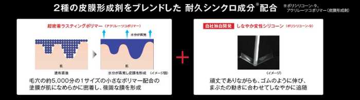 世界初*¹「耐久防壁成分(3種の皮膜形成剤の組み合わせ)」を配合し、皮脂やベースメイクの油分が浸透しにくい構造でにじみを防ぎます。