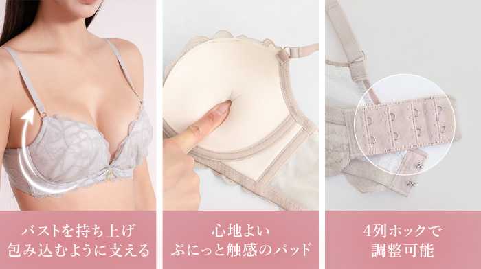 新シリーズ《ぷにぷにブラ》には、快適さと美しさをサポートするこだわりの機能が詰まっています。
