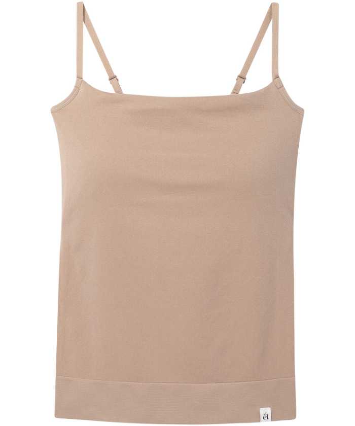 ハイマルチ糸を使用したソフトな着用感のカップ付きキャミソール。脇部分はパワーを切り替えた成型ニットで無理なくサポートします。