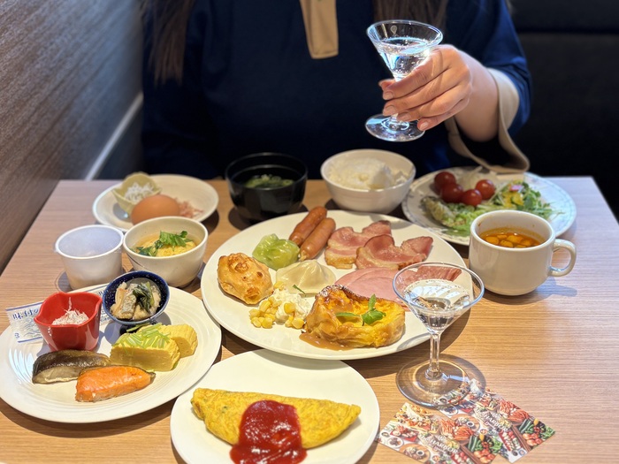 朝から元気になれそうな朝食メニューがずらり、フレッシュなサラダに出来たてのオムレツ、焼魚に小鉢、ご飯とお味噌汁など旅館の朝食メニューまで、自分好みのスタイルで楽しめるのが嬉しい!