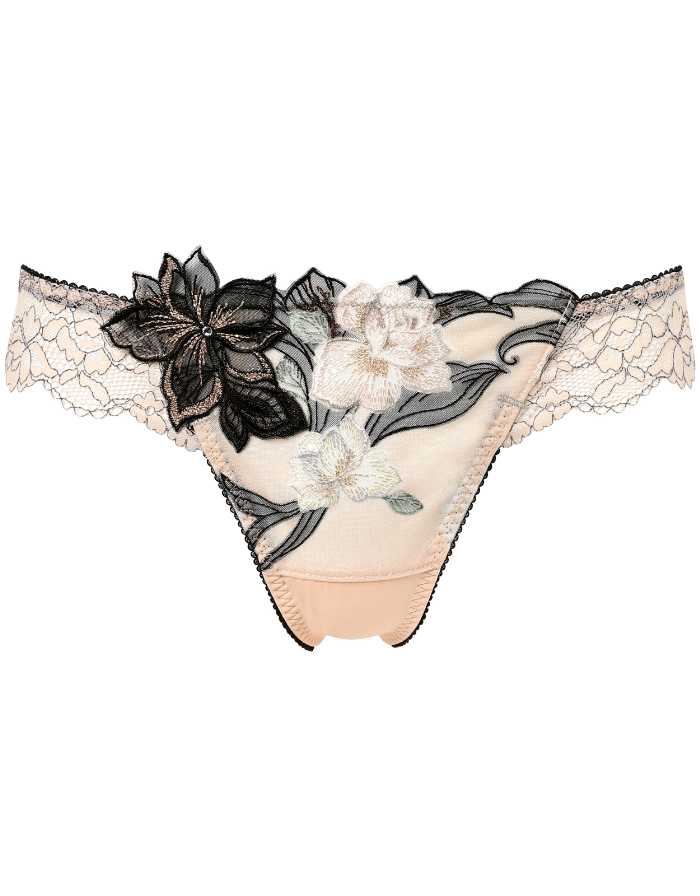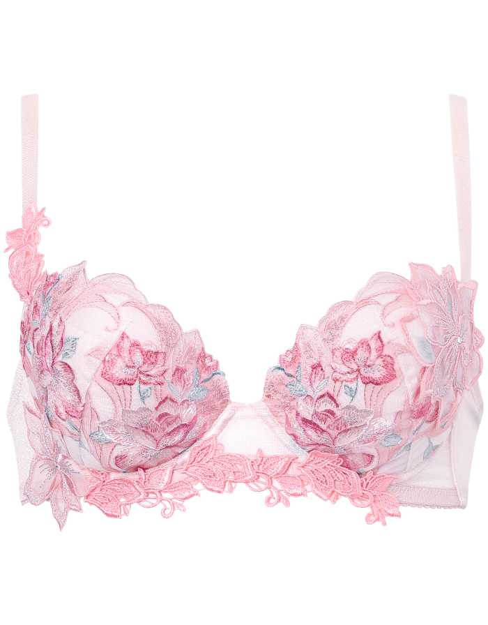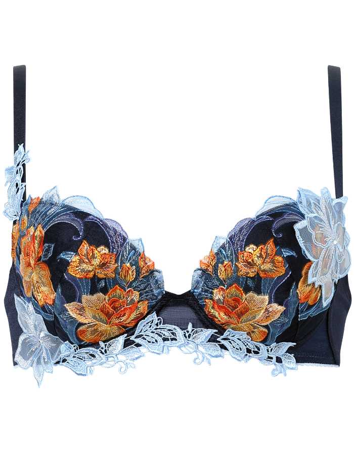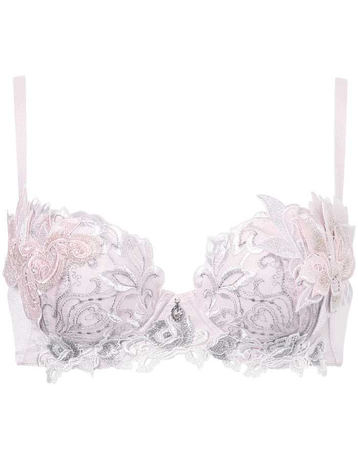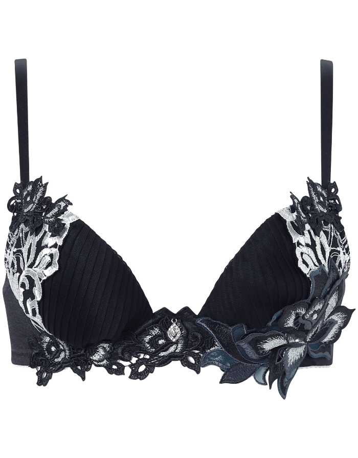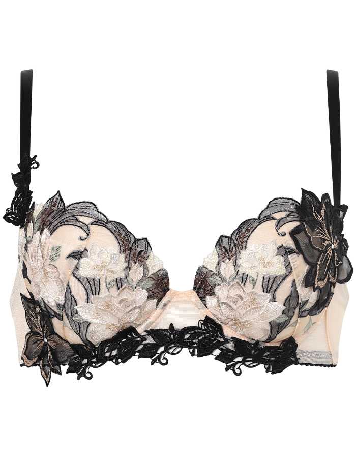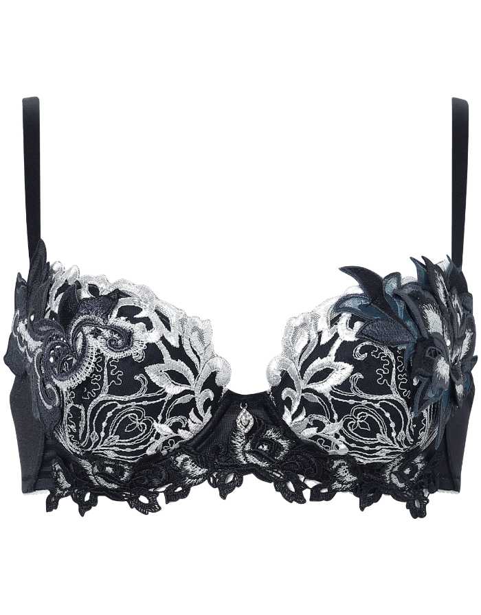 バストを脇から中央へ寄せ、きれいな谷間をつくるサルート定番のブラジャー。エレガントな刺繍レースと存在感のあるアップリケが魅力です。