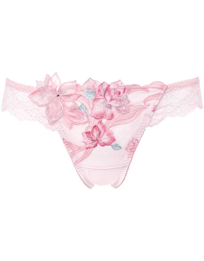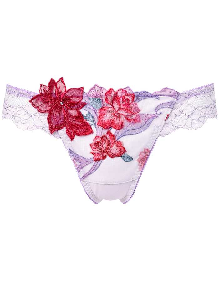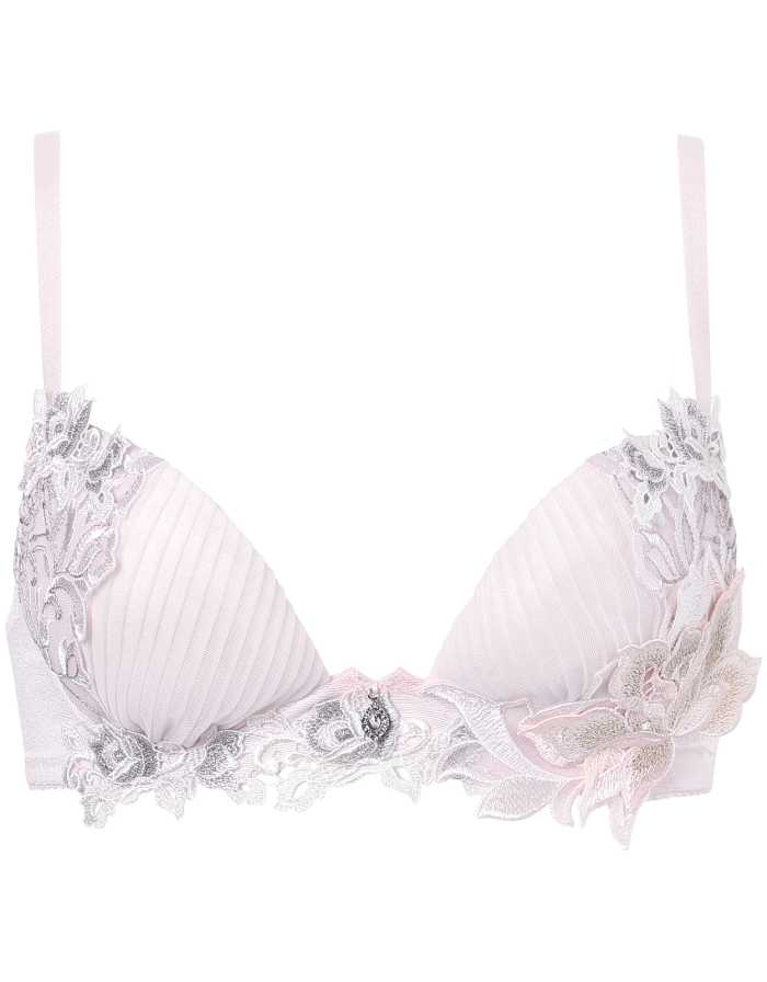 エックス状の深い谷間をメイクし、脇をすっきり見せるブラジャー。スワロフスキー・クリスタル付きアップリケとチャームが胸元を華やかに彩ります。