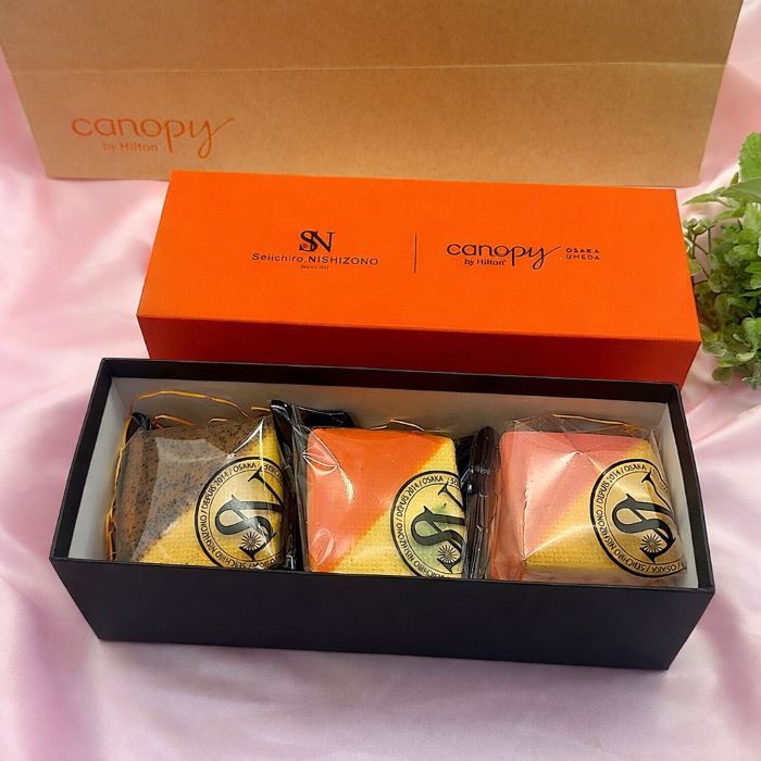 キャノピーbyヒルトンのブランドカラーを纏ったスタイリッシュなボックス。3個入りと5個入りのギフトセットが用意されており、大切な方への手土産はもちろん、日常を彩る自分へのご褒美にも最適です。