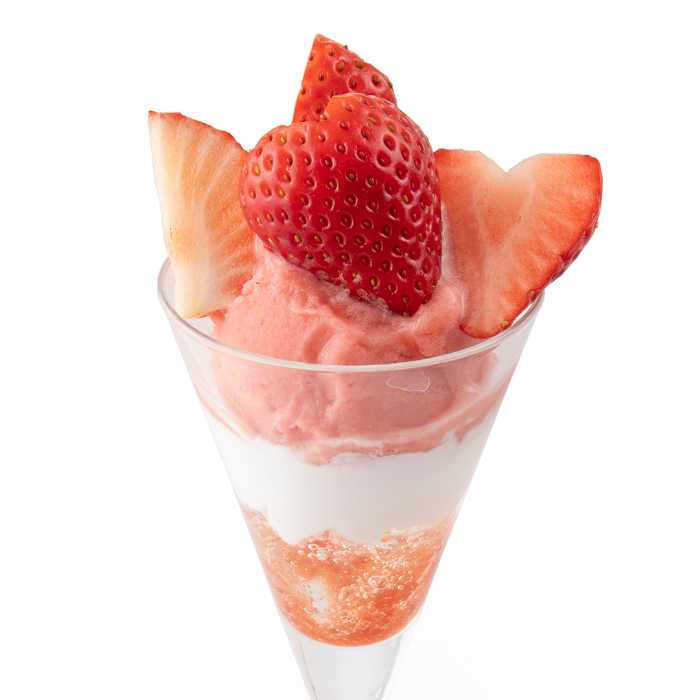 苺の香りと甘酸っぱさを感じる店内製造シャーベットに、苺ソース、コアントローゼリー、ディプロマットクリームを重ねたミニパフェです。