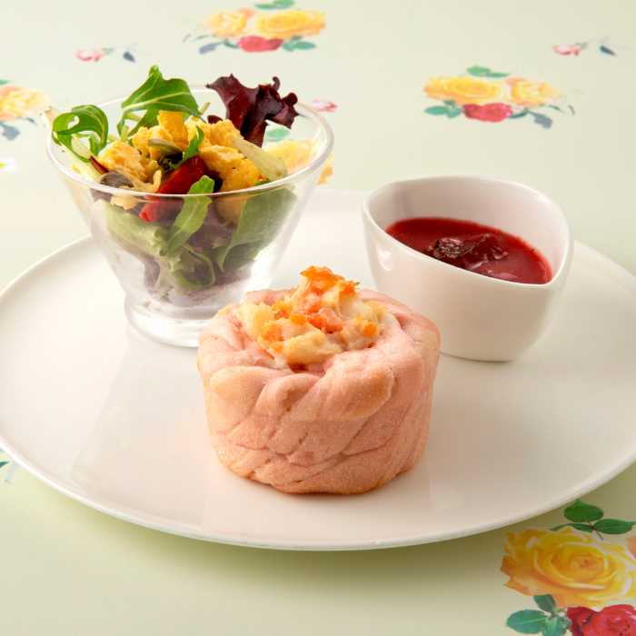 ポテトサラダのフラワーブレッド/苺とコンソメの冷製スープ/ミモザ風苺のガーデンサラダ
