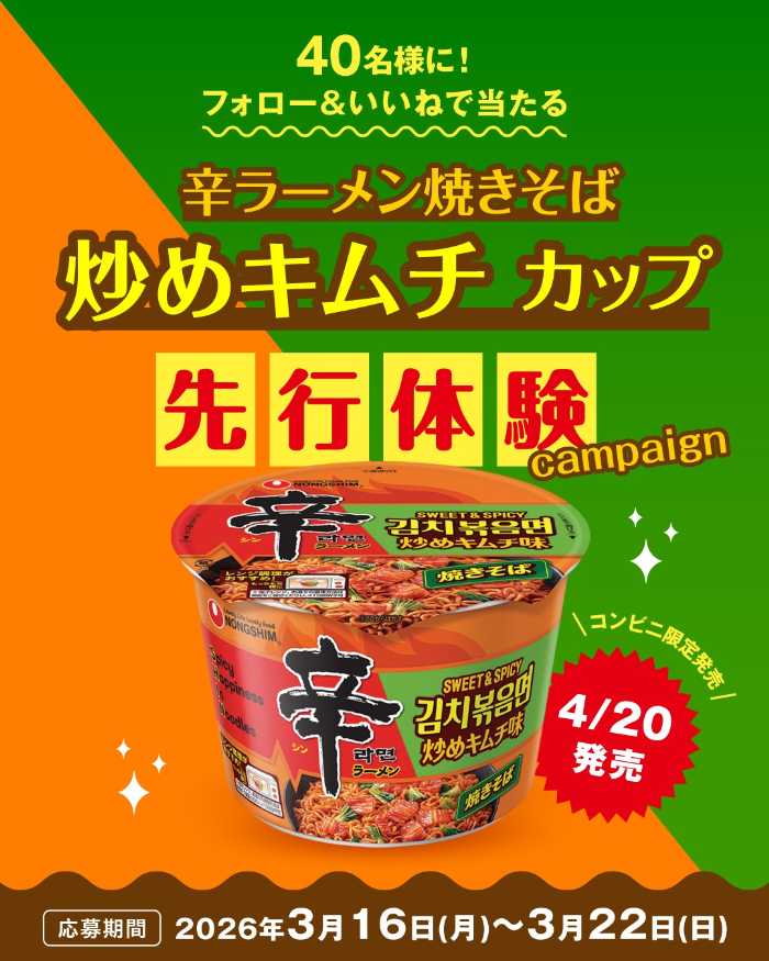 発売前の味を体験できる「辛ラーメン焼きそば炒めキムチカップ先行体験キャンペーン」も開催。辛ラーメン公式SNSをフォローし、対象投稿にアクションすることで応募できます。