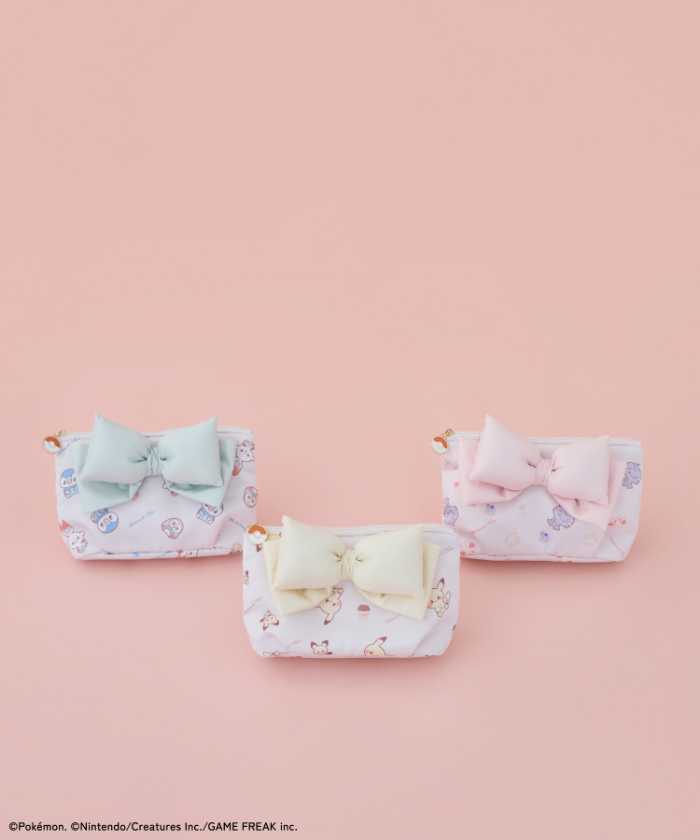 ぷっくりとしたリボンが目を引く総柄プリントポーチ。ポケモンたちの可愛いアートが散りばめられたデザインです。