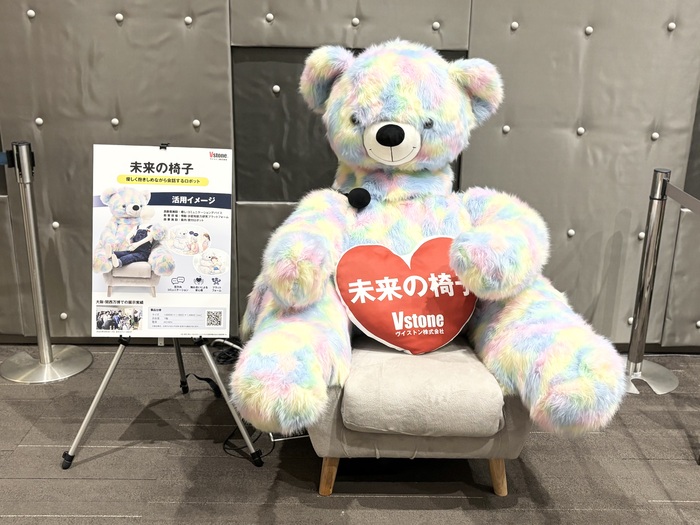 大阪・関西万博でも展示されていた「未来の椅子」。大きな可愛らしいクマちゃんが、優しく抱きしめながら会話するロボットです。イベントではお子様限定で実際に椅子座り体験する事ができます。