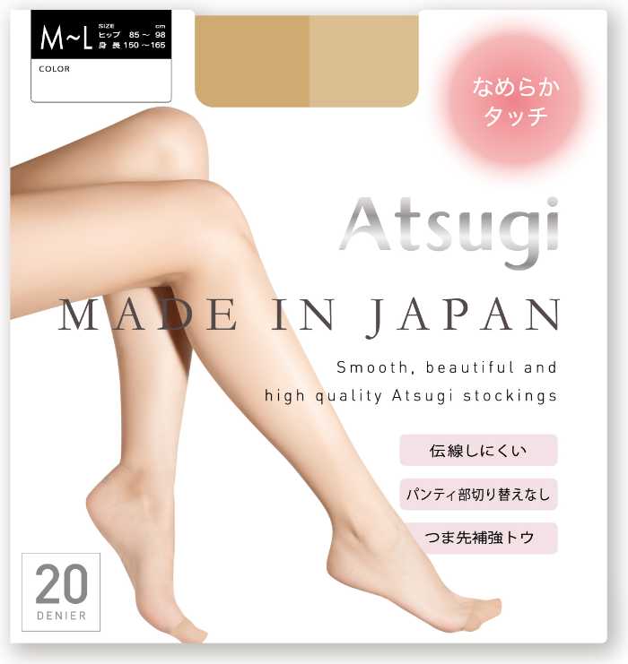 20デニール相当で、なめらかな肌触りが特徴のストッキング。横ジマが出にくく、キメの整った美しい脚を演出します。