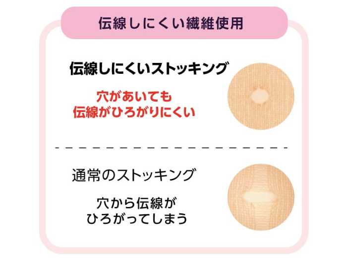 よく伸びるサポーティ糸で編み上げられており、肌なじみが良く適度なフィット感を実現。さらに、穴があいても伝線が広がりにくい繊維を使用している点も魅力です。