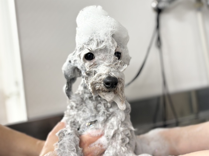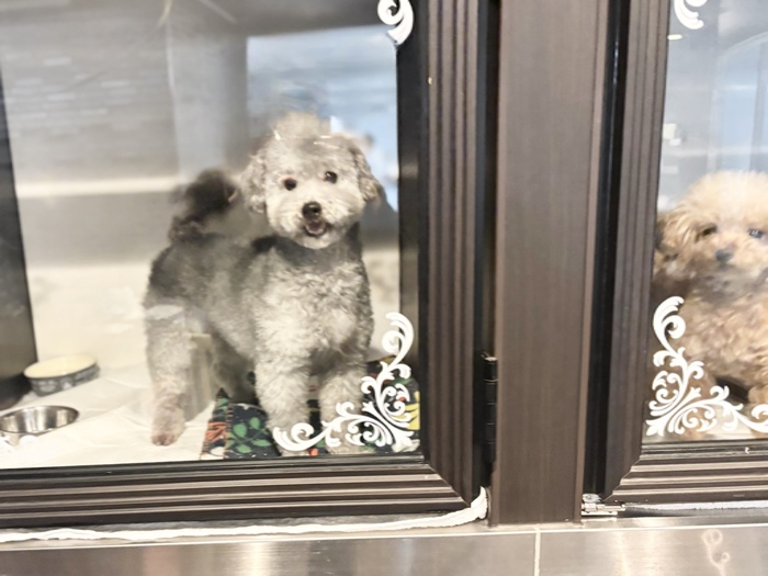 ホテル併設の「ドギーパレス」に宿泊。お泊まりと一緒にカット&シャンプーもお願いしました。シャンプーに使用するシャワーには、ミラブルのシャワーヘッド「ミラブルプロα」」を使用。