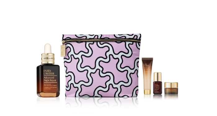 美容液「アドバンス ナイト リペア」や日本発の医薬部外品スキンケア「アクア チャージ」などの対象スキンケア製品を9,900円(税込)以上購入すると、限定バッグと人気スキンケアのスペシャルサイズ3品をセットでプレゼント。