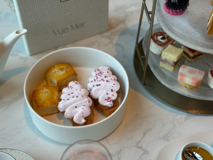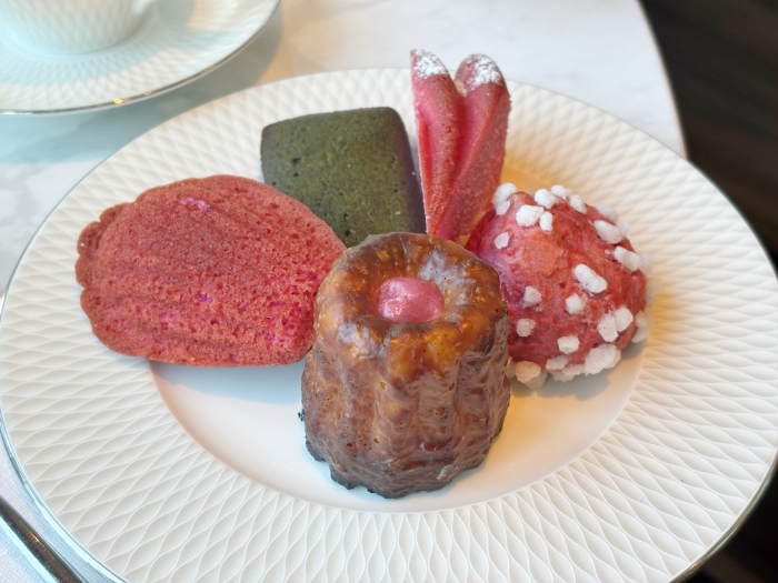 アフタヌーンティーで楽しめるトロリーサービスでは、フランスで古くから愛される初登場の「シューケット」をはじめ、マドレーヌやパウンドケーキなど、桜の香りで春の装いに仕立てた焼き菓子が。
