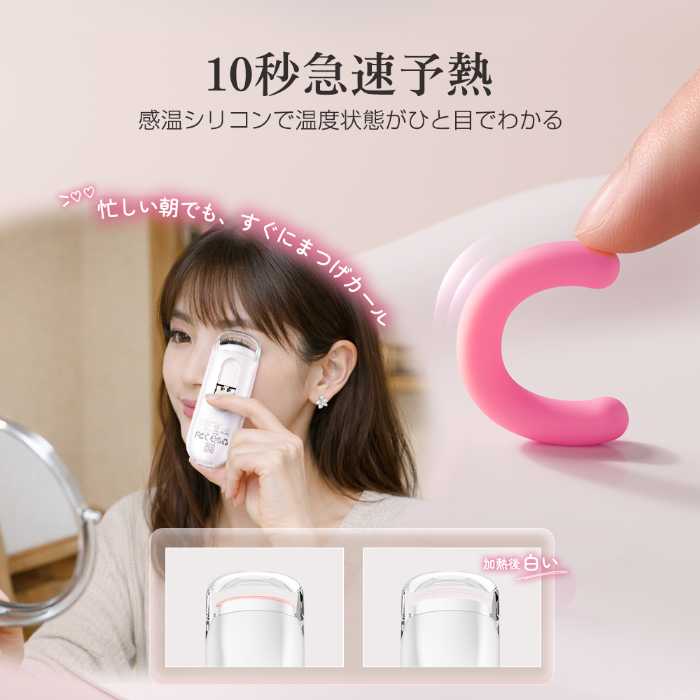 電源を入れてすぐに使えるため、メイク時間の短縮はもちろん、外出先でのメイク直しにもぴったり。約1分でプロ級のカールが完成し、きれいな上向きまつ毛を長時間キープします。