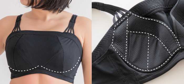 バストの揺れを軽減するハイサポート設計が特徴。カップ上辺に内蔵されたゴムバンドが運動時の揺れを抑え、バストをしっかり守ります。