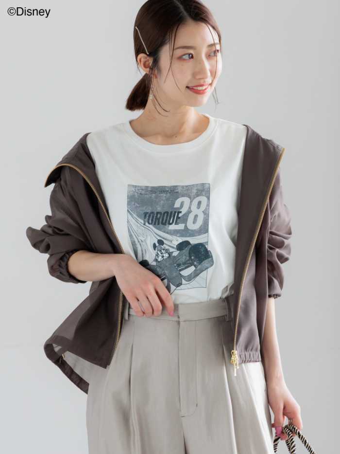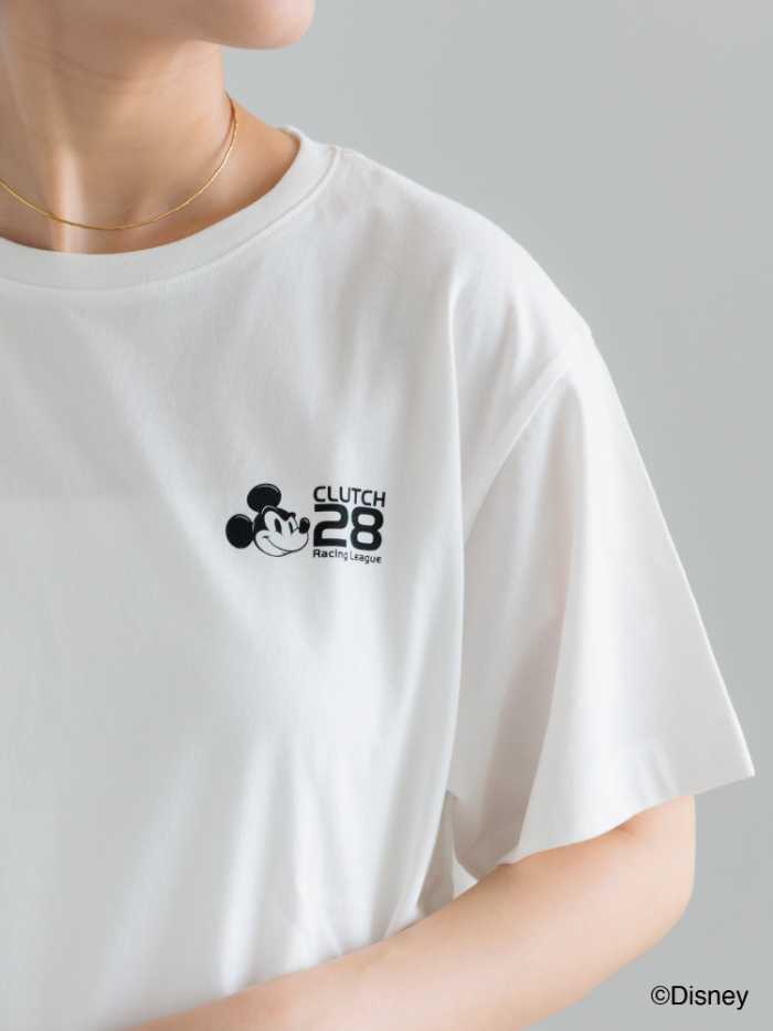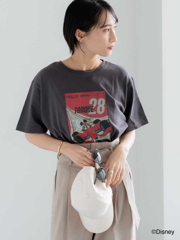 レーシングポスター風のグラフィックとミッキーマウスを組み合わせた、ヴィンテージライクなデザイン。1枚で主役になる存在感があり、シンプルなボトムと合わせるだけでおしゃれに決まります。
