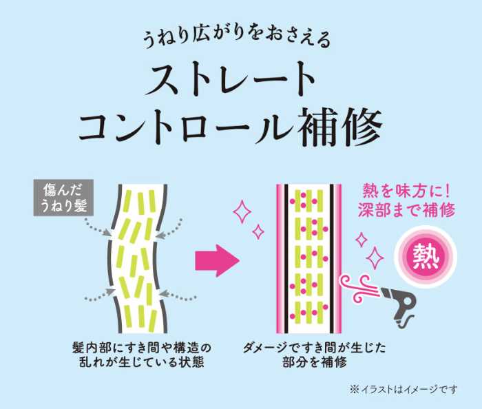 ドライヤーの熱を活かすストレートコントロール処方で、ダメージを補修しながら毛先までまとまる美しいストレートヘアへ導きます。