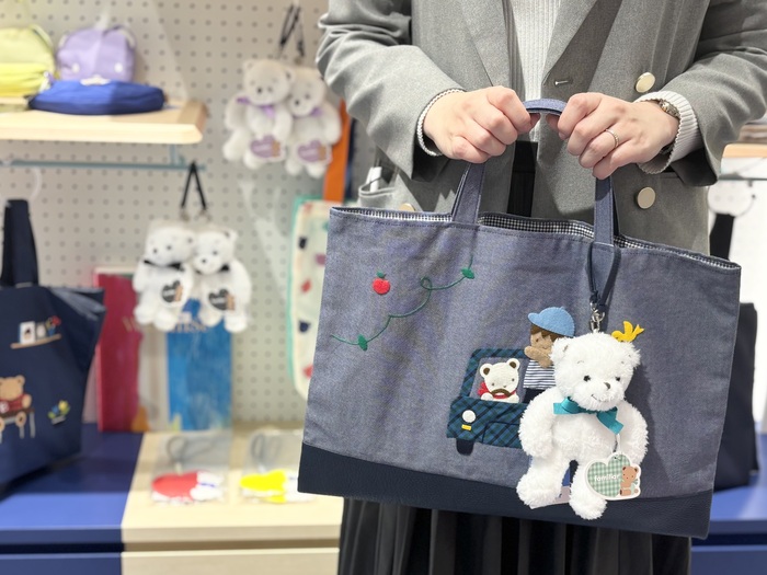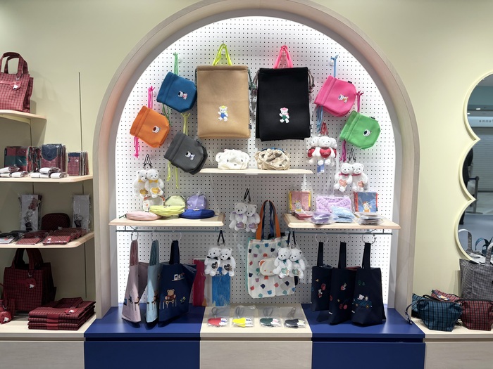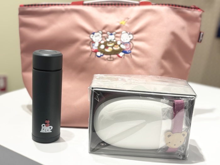 なんばCITY店限定アイテムも登場!ショップのデザインをイメージした、赤やピンクの可愛らしい雑貨アイテムは、「マルチポーチ」や「ミニタオルハンカチ」など、普段使いできるアイテムがたくさん並んでいます。