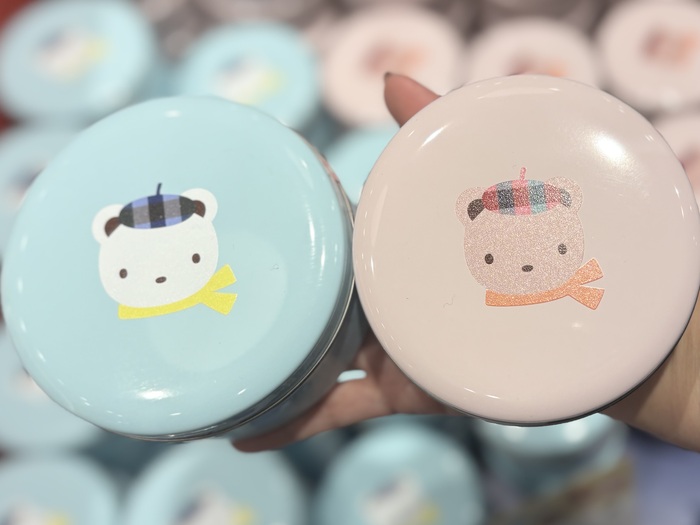 ライフスタイルショップ限定の「ファミリアオリジナルのクッキー缶」。ブルーの缶はチーズとココア、ピンクの缶はメープルキャラメルとプレーンで、異なる2種類のクッキーが販売されています。