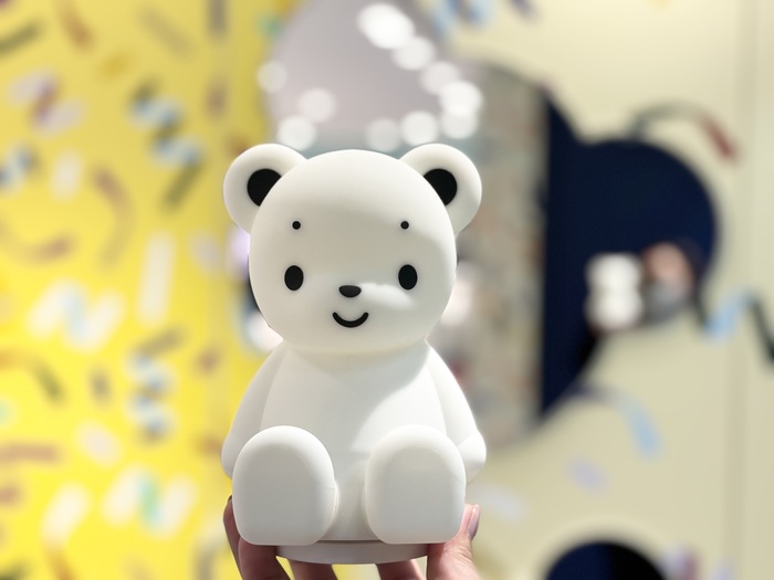 レジのお隣にはクマの形をした鏡が。ポップなイエローの壁紙は、お気に入りのアイテムと一緒にフォトスポットとしても利用いただけるスペースになっております。