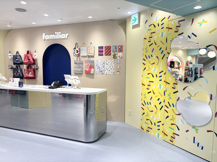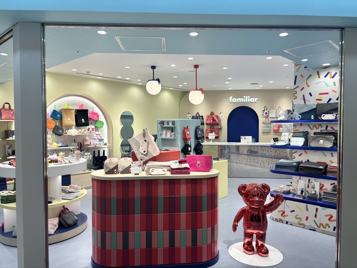 店頭では、赤いメタリックのファミちゃんがお出迎えしてくれます。店内のインテリアやファミリアチェックともリンクするような明るいカラーはお買い物の気持ちもあがります。