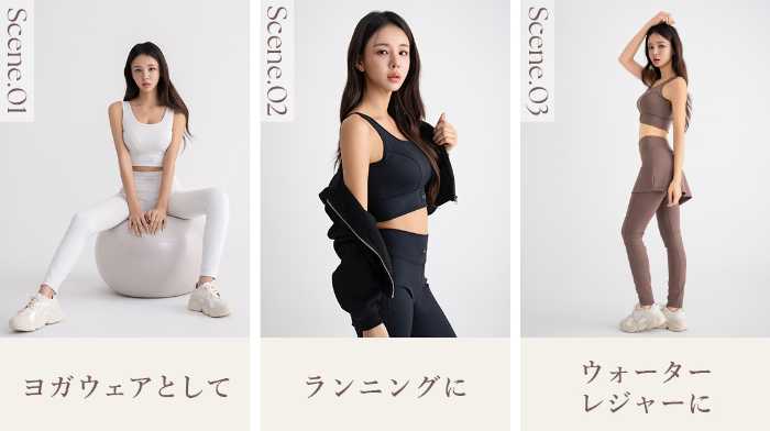 運動時も女性らしいシルエットを崩さない設計で、インナーとしてだけでなく1枚で“魅せる”着こなしが叶います。