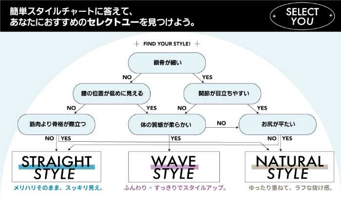 「SELECT YOU」は、ストレート・ウェーブ・ナチュラルの3スタイル展開。それぞれの骨格タイプに合わせた設計で、自分に似合う理由が明確になるのが特長です。