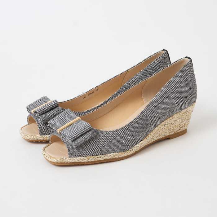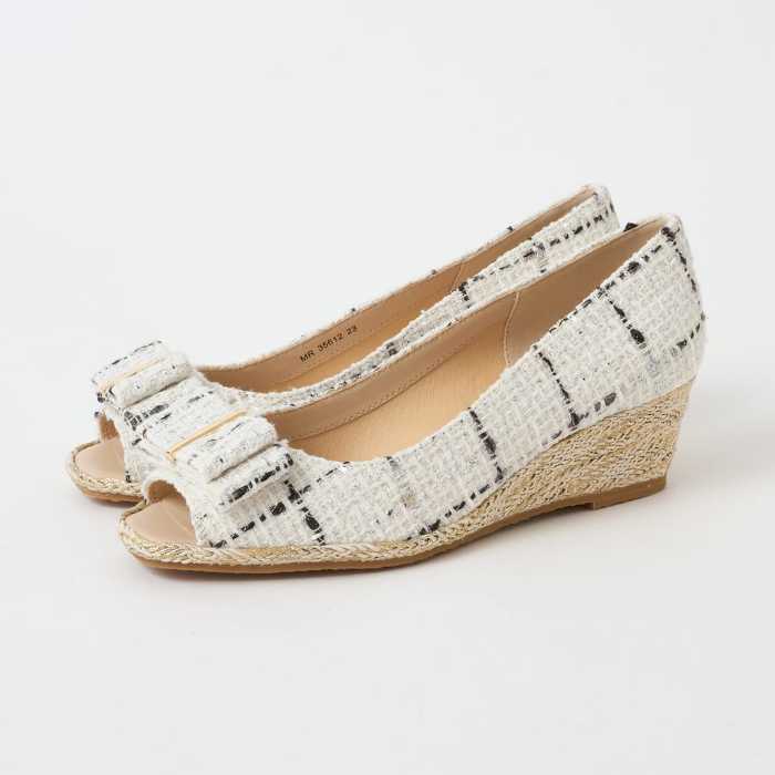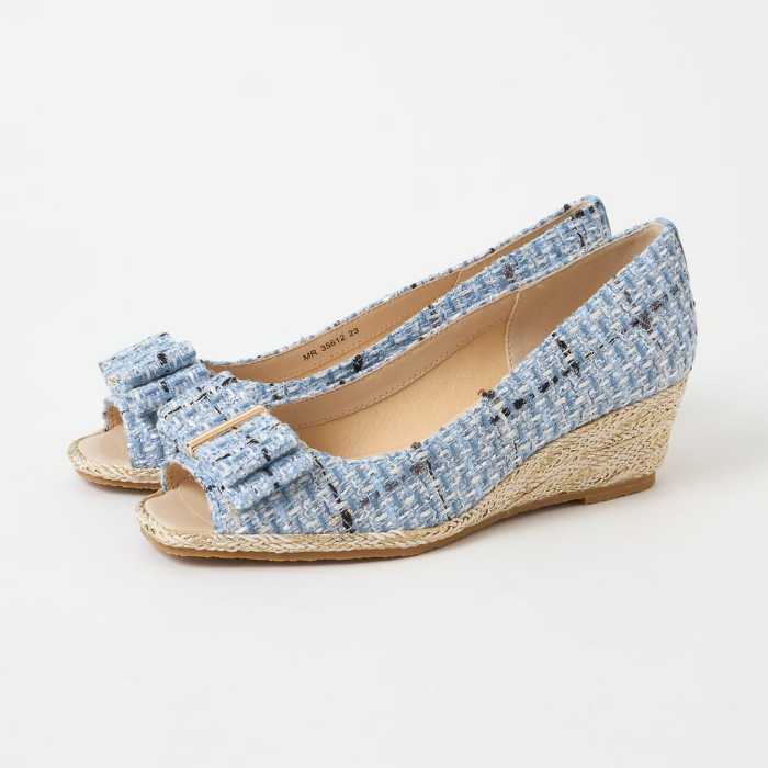 リボン付きオープントゥウェッジサンダルは、5cm台ヒールで安定感がありながら、女性らしい可愛さをプラスしてくれる一足。