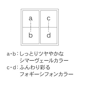 ツヤとフォギー、異なる2つの質感と4色を自由に重ねることで、透明感あふれる仕上がりを実現。