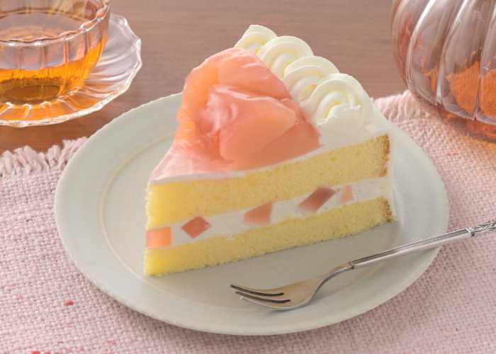 大きくカットされた白桃は、とろけるような食感とジューシーさが特長で、ケーキ全体に贅沢感をプラスしてくれます。