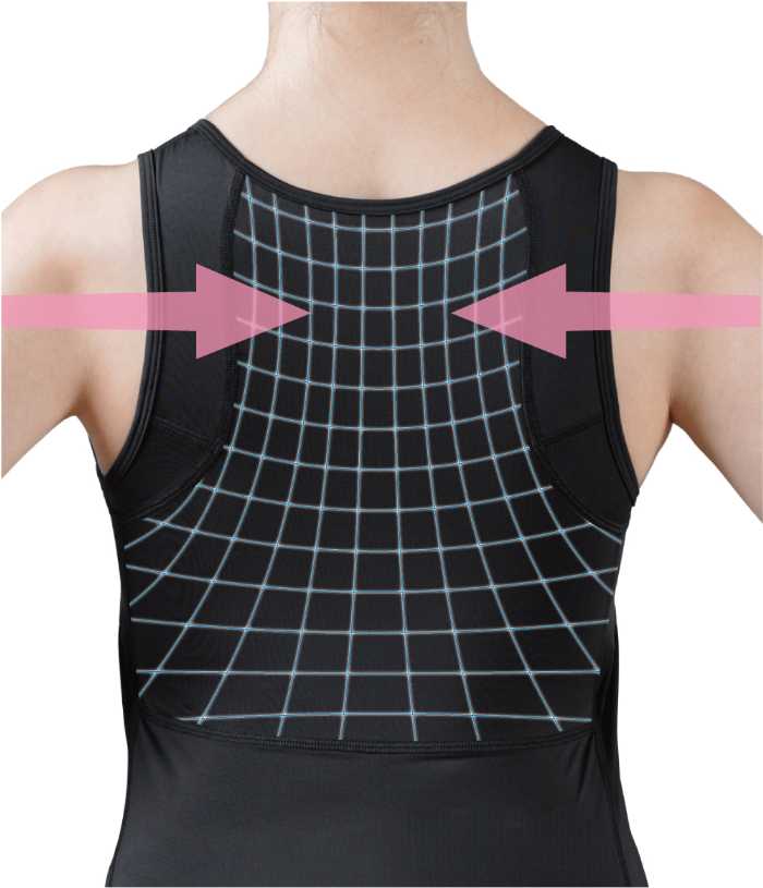 さらに、後ろ身頃上部に配置された大型パワーネットによるバックリリース機能が、肩甲骨を内側に引き寄せながら肩の位置を整えます。