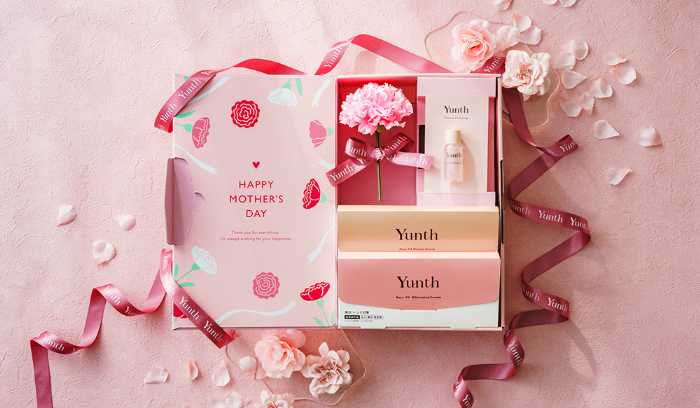 今回の「Yunthスペシャルギフト2026」は、箱を開ける瞬間まで楽しめるデザインが魅力。リボン付きのギフトボックスに、感謝の気持ちを込めたイラストとカーネーション(造花)を添えた華やかな仕様です。