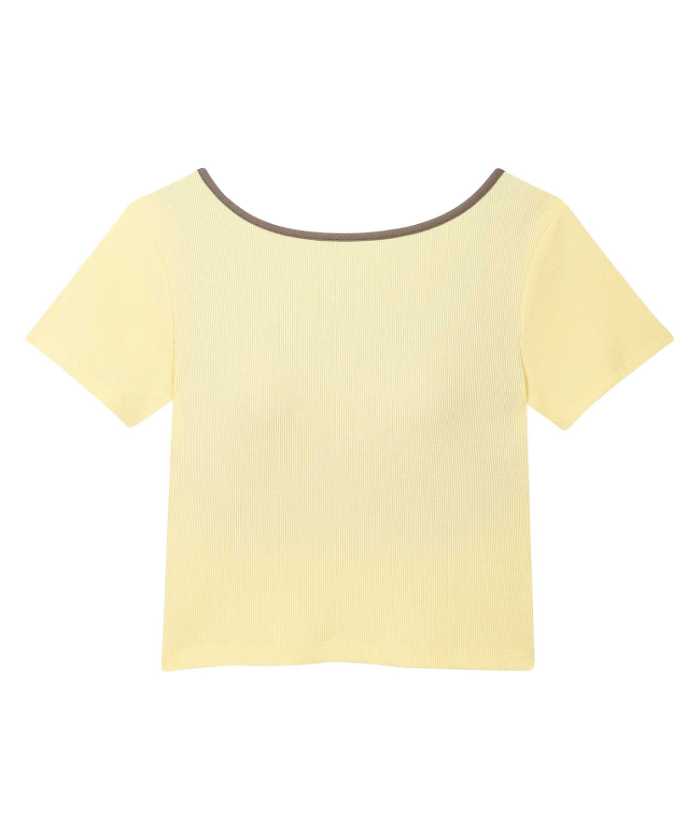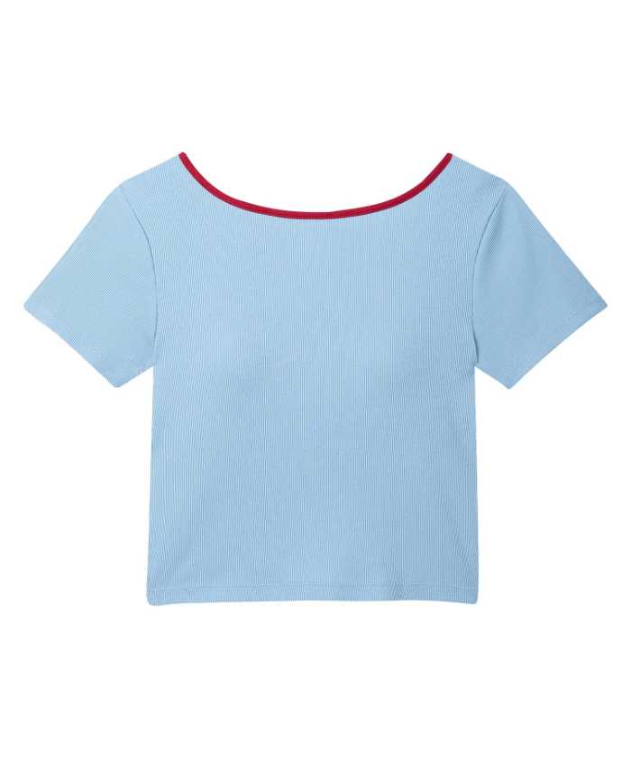 「カップ付きトップス」は4,990円(税込)、カラーはクリーム(CR)とサックス(SX)、サイズはM。バックオープンデザインでも安心して着られる1枚で、ショート丈が今っぽい印象を演出します。